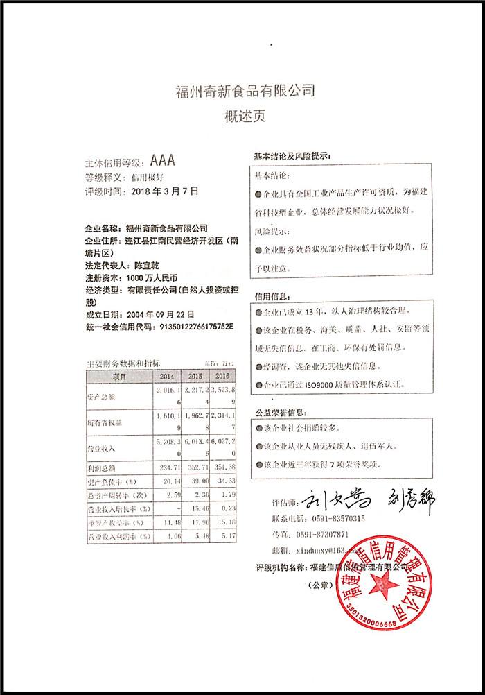 福州奇新食品有限公司 XDPJ201803143