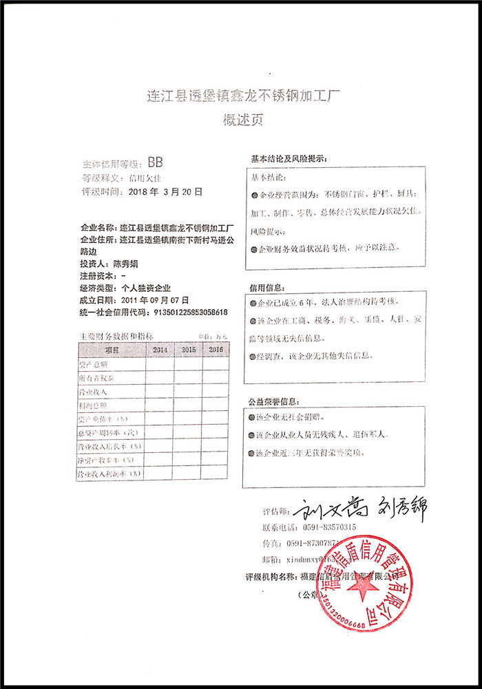 連江縣透堡鎮鑫龍不銹鋼加工廠 XDPJ201803221